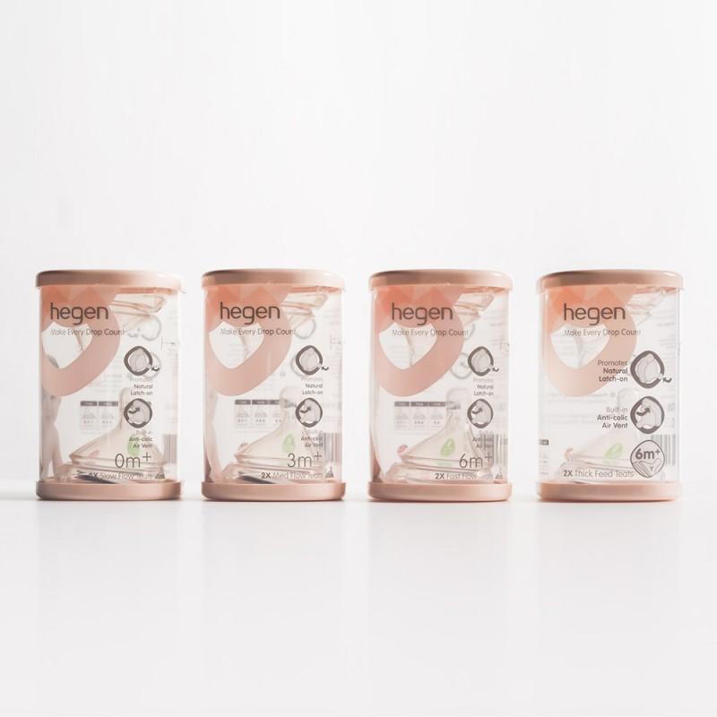 Additional teats of various sizes sold separately allow mothers to simply swap to their choice of teats (slow/medium/fast) for baby’s perfect feed as time goes by. Simply assemble the teat into the collar and instantly becomes a feeding lid for baby. Hegen teats are designed to encourage seamless breast and bottle feeding, minimising nipple confusion and promoting natural latch-on for babies.
